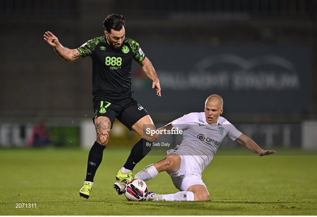 26 August 2021; Richie Towell of Shamrock Rovers in action against Henrik Ojamaa of Flora Tallinn during the UEFA Europa Conference League play-off second leg match between Shamrock Rovers and Flora Tallinn at Tallaght Stadium in Dublin. Photo by Seb Daly/Sportsfile