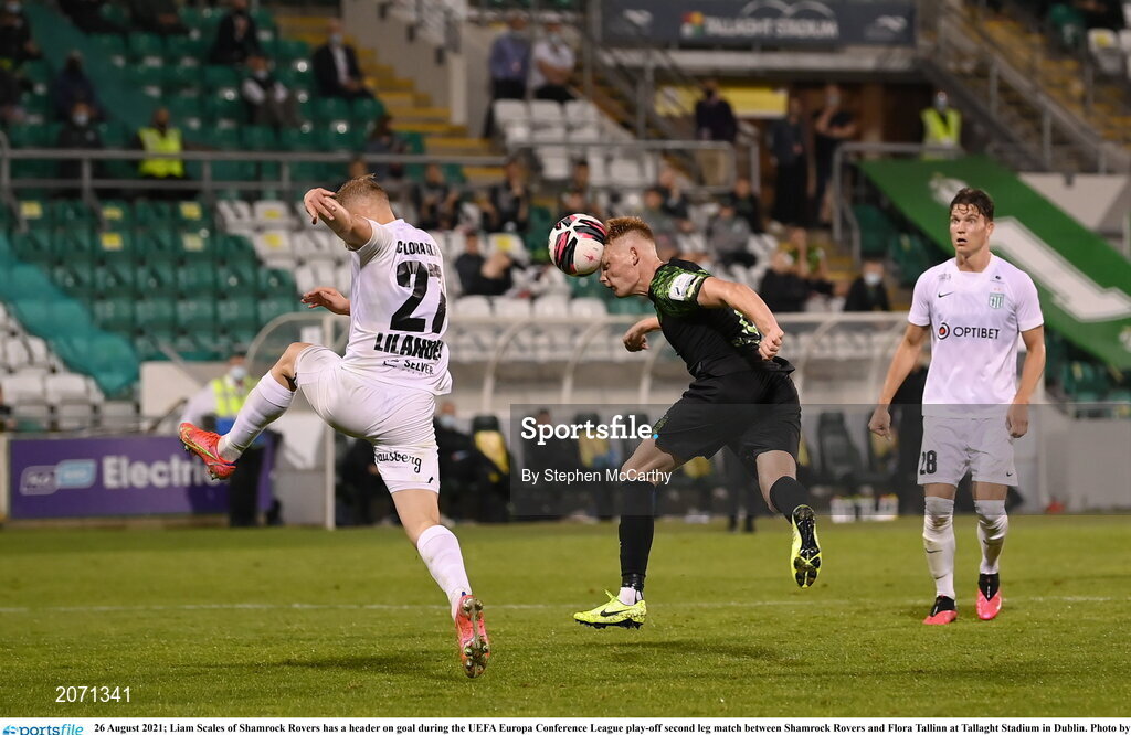 26 August 2021; Liam Scales of Shamrock Rovers has a header on goal during the UEFA Europa Conference League play-off second leg match between Shamrock Rovers and Flora Tallinn at Tallaght Stadium in Dublin. Photo by Stephen McCarthy/Sportsfile