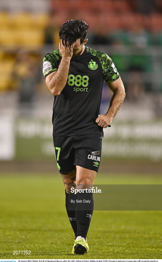 26 August 2021; Richie Towell of Shamrock Rovers after his side's defeat to Flora Tallinn in their UEFA Europa Conference League play-off second leg match at Tallaght Stadium in Dublin. Photo by Seb Daly/Sportsfile