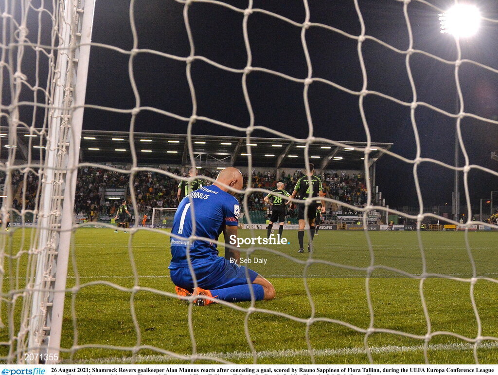 26 August 2021; Shamrock Rovers goalkeeper Alan Mannus reacts after conceding a goal, scored by Rauno Sappinen of Flora Tallinn, during the UEFA Europa Conference League play-off second leg match between Shamrock Rovers and Flora Tallinn at Tallaght Stadium in Dublin. Photo by Seb Daly/Sportsfile