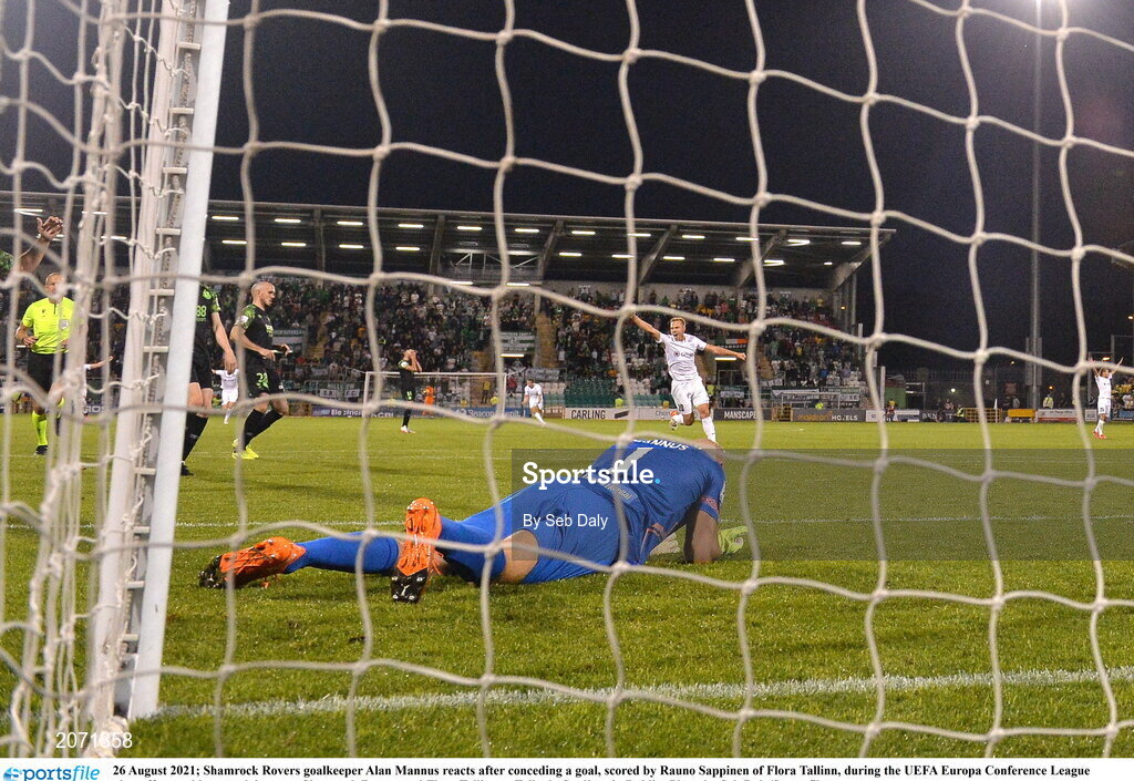 26 August 2021; Shamrock Rovers goalkeeper Alan Mannus reacts after conceding a goal, scored by Rauno Sappinen of Flora Tallinn, during the UEFA Europa Conference League play-off second leg match between Shamrock Rovers and Flora Tallinn at Tallaght Stadium in Dublin. Photo by Seb Daly/Sportsfile
