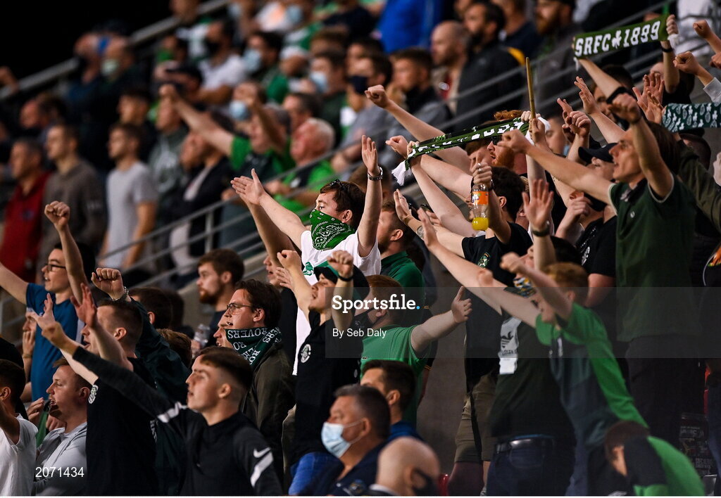 26 August 2021; Shamrock Rovers supporters during the UEFA Europa Conference League play-off second leg match between Shamrock Rovers and Flora Tallinn at Tallaght Stadium in Dublin. Photo by Seb Daly/Sportsfile