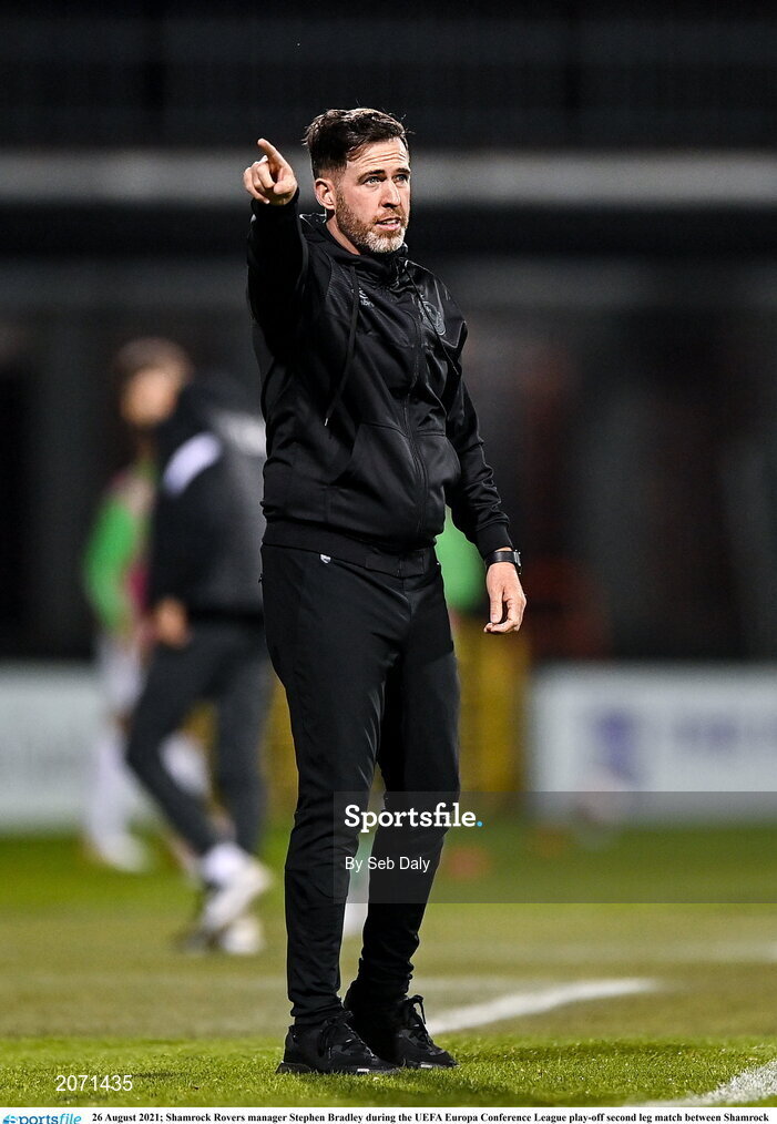 26 August 2021; Shamrock Rovers manager Stephen Bradley during the UEFA Europa Conference League play-off second leg match between Shamrock Rovers and Flora Tallinn at Tallaght Stadium in Dublin. Photo by Seb Daly/Sportsfile