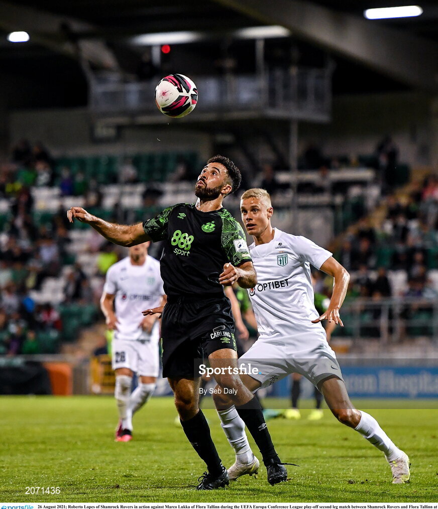 26 August 2021; Roberto Lopes of Shamrock Rovers in action against Marco Lukka of Flora Tallinn during the UEFA Europa Conference League play-off second leg match between Shamrock Rovers and Flora Tallinn at Tallaght Stadium in Dublin. Photo by Seb Daly/Sportsfile