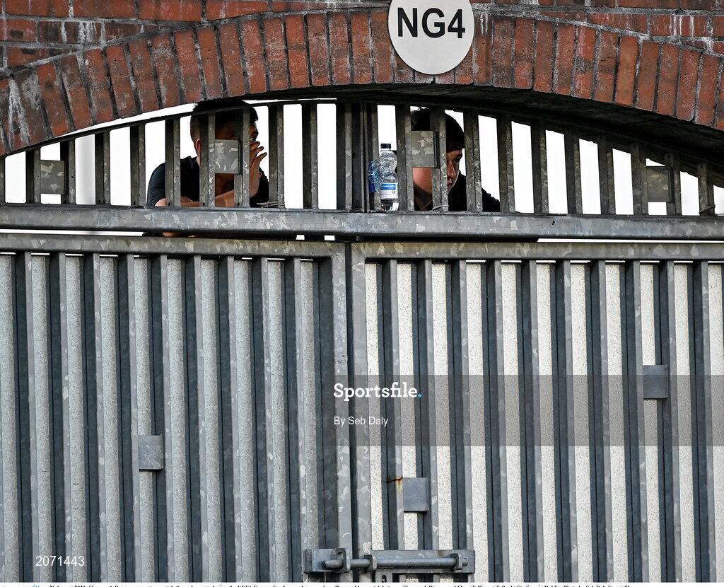26 August 2021; Shamrock Rovers supporters watch through a gate during the UEFA Europa Conference League play-off second leg match between Shamrock Rovers and Flora Tallinn at Tallaght Stadium in Dublin. Photo by Seb Daly/Sportsfile