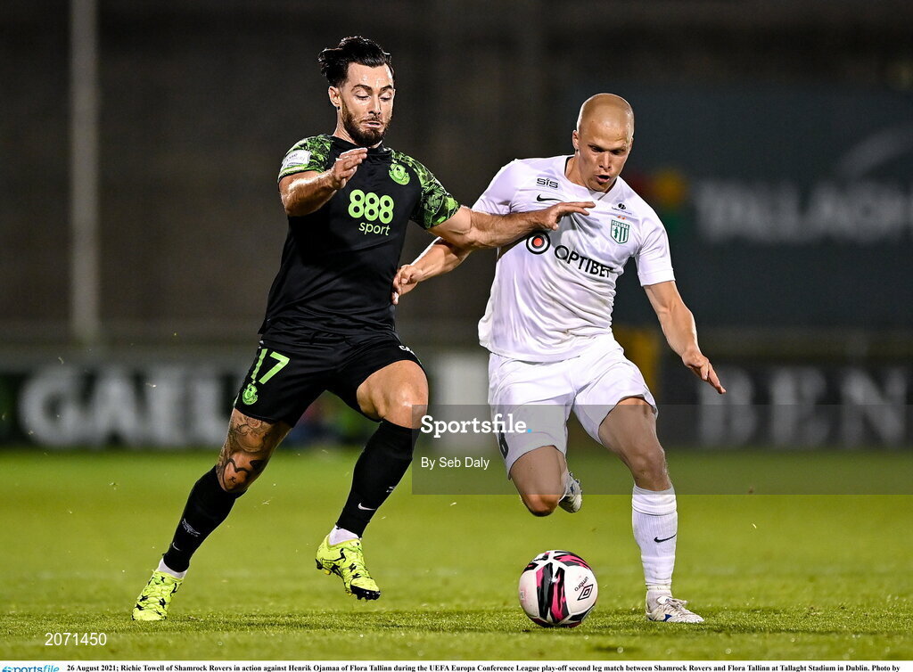 26 August 2021; Richie Towell of Shamrock Rovers in action against Henrik Ojamaa of Flora Tallinn during the UEFA Europa Conference League play-off second leg match between Shamrock Rovers and Flora Tallinn at Tallaght Stadium in Dublin. Photo by Seb Daly/Sportsfile