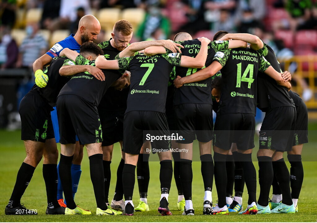 26 August 2021; Shamrock Rovers players huddle before the UEFA Europa Conference League play-off second leg match between Shamrock Rovers and Flora Tallinn at Tallaght Stadium in Dublin. Photo by Stephen McCarthy/Sportsfile