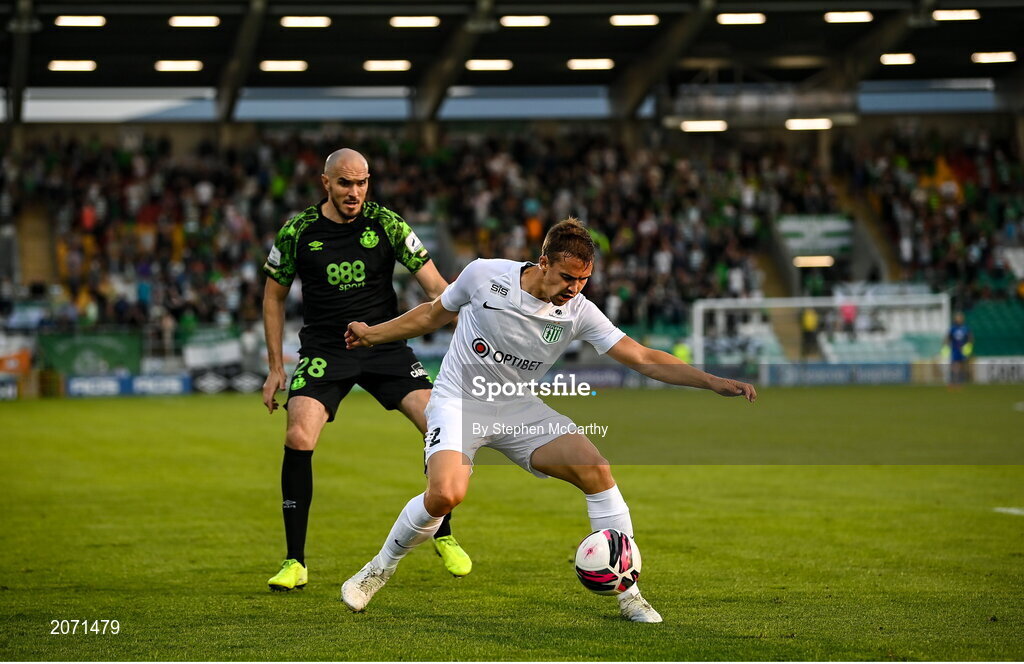 26 August 2021; Märten Kuusk of Flora Tallinn in action against Joey O'Brien of Shamrock Rovers during the UEFA Europa Conference League play-off second leg match between Shamrock Rovers and Flora Tallinn at Tallaght Stadium in Dublin. Photo by Stephen McCarthy/Sportsfile