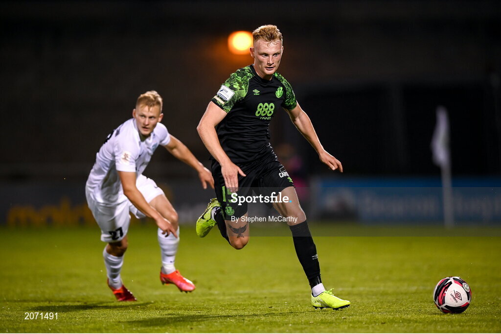 26 August 2021; Liam Scales of Shamrock Rovers in action against Michael Lilander of Flora Tallinn during the UEFA Europa Conference League play-off second leg match between Shamrock Rovers and Flora Tallinn at Tallaght Stadium in Dublin. Photo by Stephen McCarthy/Sportsfile