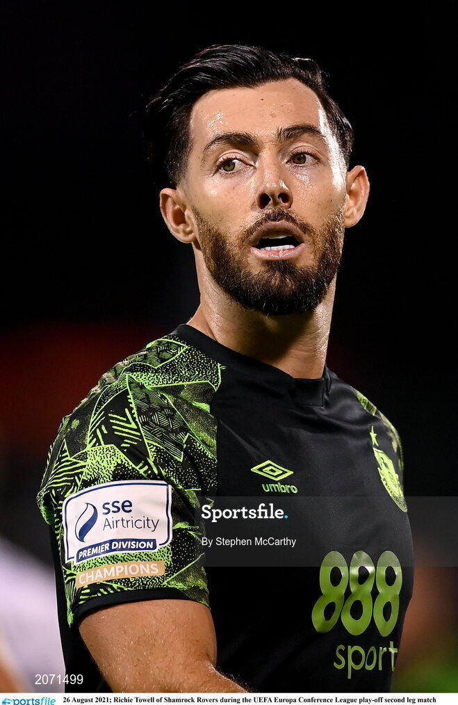 26 August 2021; Richie Towell of Shamrock Rovers during the UEFA Europa Conference League play-off second leg match between Shamrock Rovers and Flora Tallinn at Tallaght Stadium in Dublin. Photo by Stephen McCarthy/Sportsfile