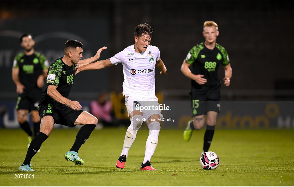 26 August 2021; Markus Soomets of Flora Tallinn in action against Aaron Greene of Shamrock Rovers during the UEFA Europa Conference League play-off second leg match between Shamrock Rovers and Flora Tallinn at Tallaght Stadium in Dublin. Photo by Stephen McCarthy/Sportsfile