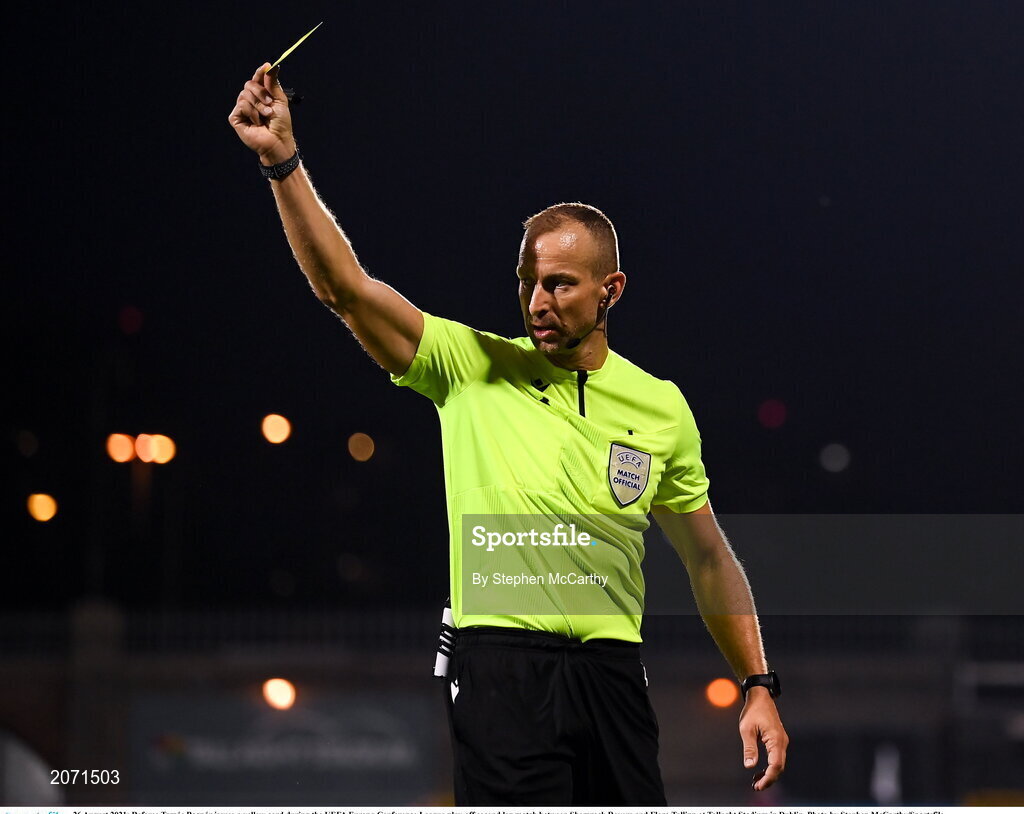 26 August 2021; Referee Tamás Bognár issues a yellow card during the UEFA Europa Conference League play-off second leg match between Shamrock Rovers and Flora Tallinn at Tallaght Stadium in Dublin. Photo by Stephen McCarthy/Sportsfile