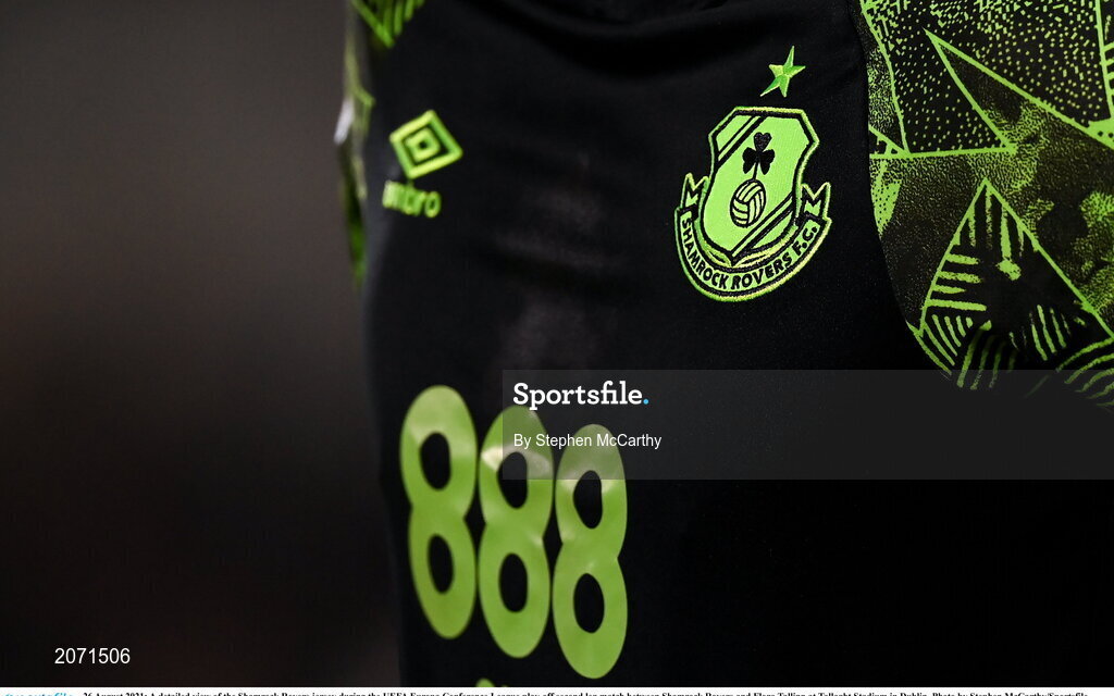 26 August 2021; A detailed view of the Shamrock Rovers jersey during the UEFA Europa Conference League play-off second leg match between Shamrock Rovers and Flora Tallinn at Tallaght Stadium in Dublin. Photo by Stephen McCarthy/Sportsfile