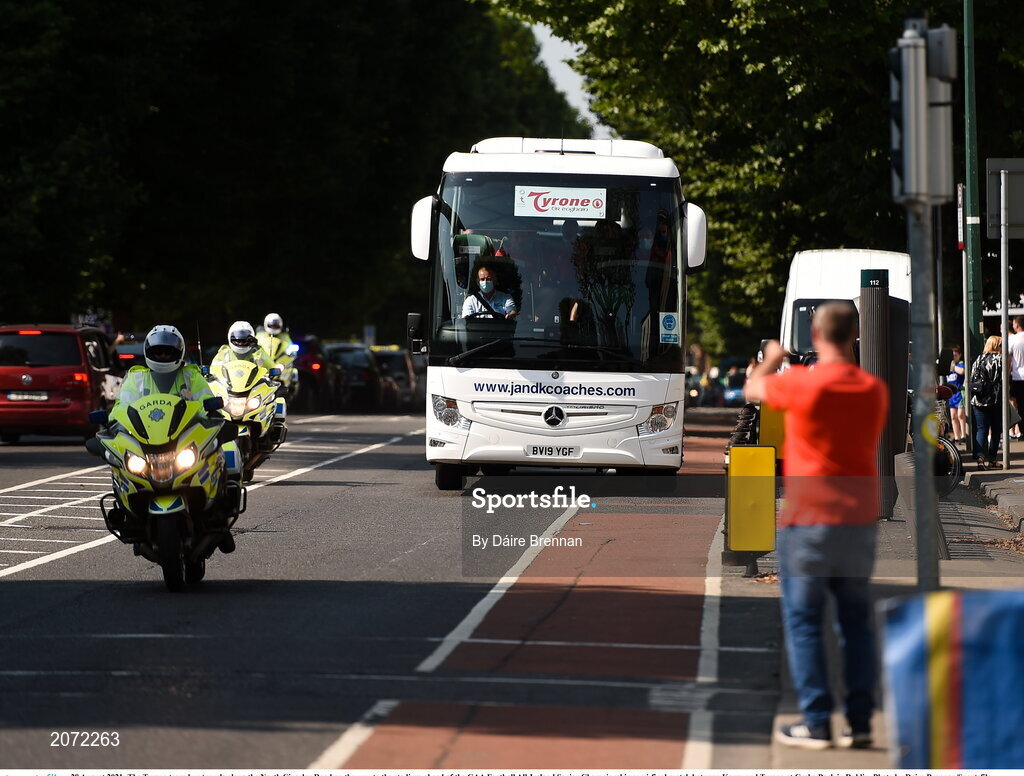 28 August 2021; The Tyrone team bus travels along the North Circular Road on the way to the stadium ahead of the GAA Football All-Ireland Senior Championship semi-final match between Kerry and Tyrone at Croke Park in Dublin. Photo by Daire Brennan/Sportsfile