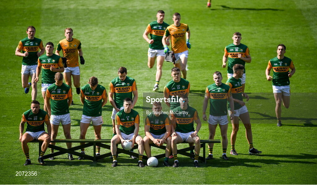 28 August 2021; Kerry players take their seat on the bench for the team photograph before the GAA Football All-Ireland Senior Championship semi-final match between Kerry and Tyrone at Croke Park in Dublin. Photo by Stephen McCarthy/Sportsfile