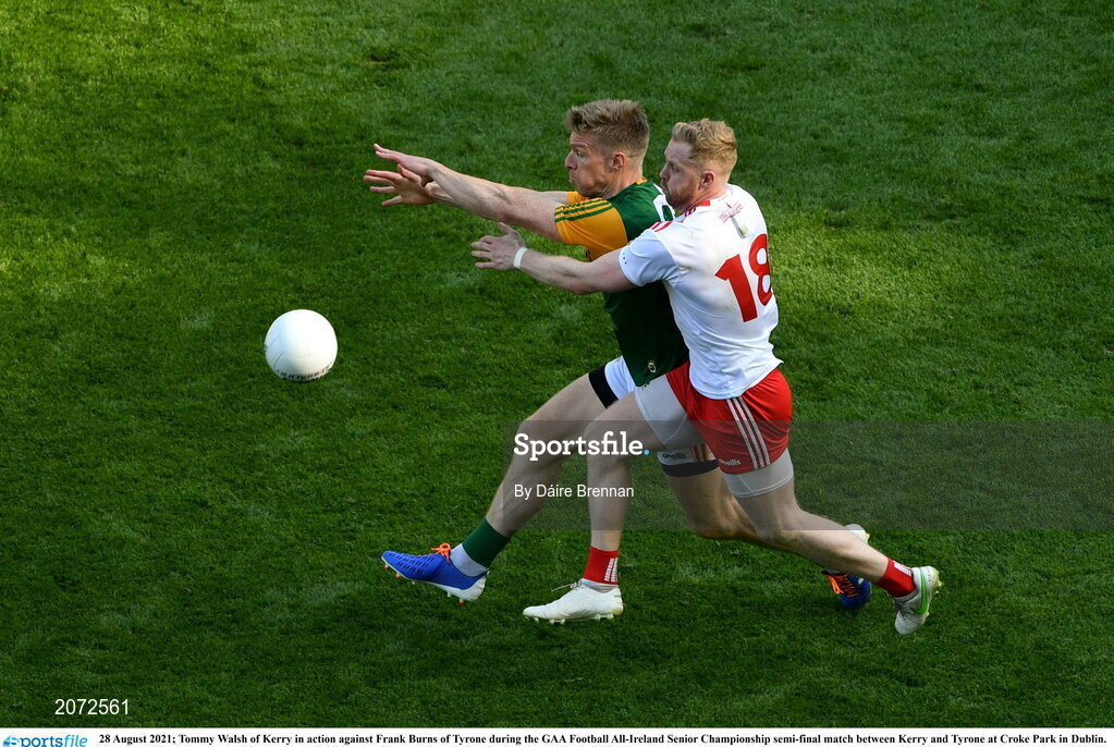 28 August 2021; Tommy Walsh of Kerry in action against Frank Burns of Tyrone during the GAA Football All-Ireland Senior Championship semi-final match between Kerry and Tyrone at Croke Park in Dublin. Photo by Daire Brennan/Sportsfile