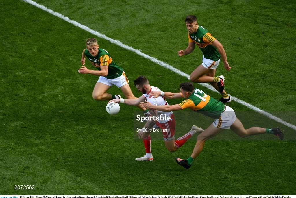 28 August 2021; Ronan McNamee of Tyrone in action against Kerry players, left to right, Killian Spillane, David Clifford, and Adrian Spillane during the GAA Football All-Ireland Senior Championship semi-final match between Kerry and Tyrone at Croke Park in Dublin. Photo by Daire Brennan/Sportsfile