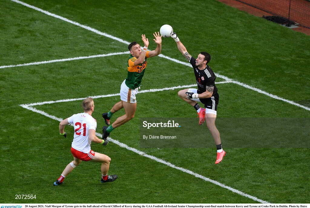 28 August 2021; Niall Morgan of Tyrone gets to the ball ahead of David Clifford of Kerry during the GAA Football All-Ireland Senior Championship semi-final match between Kerry and Tyrone at Croke Park in Dublin. Photo by Daire Brennan/Sportsfile