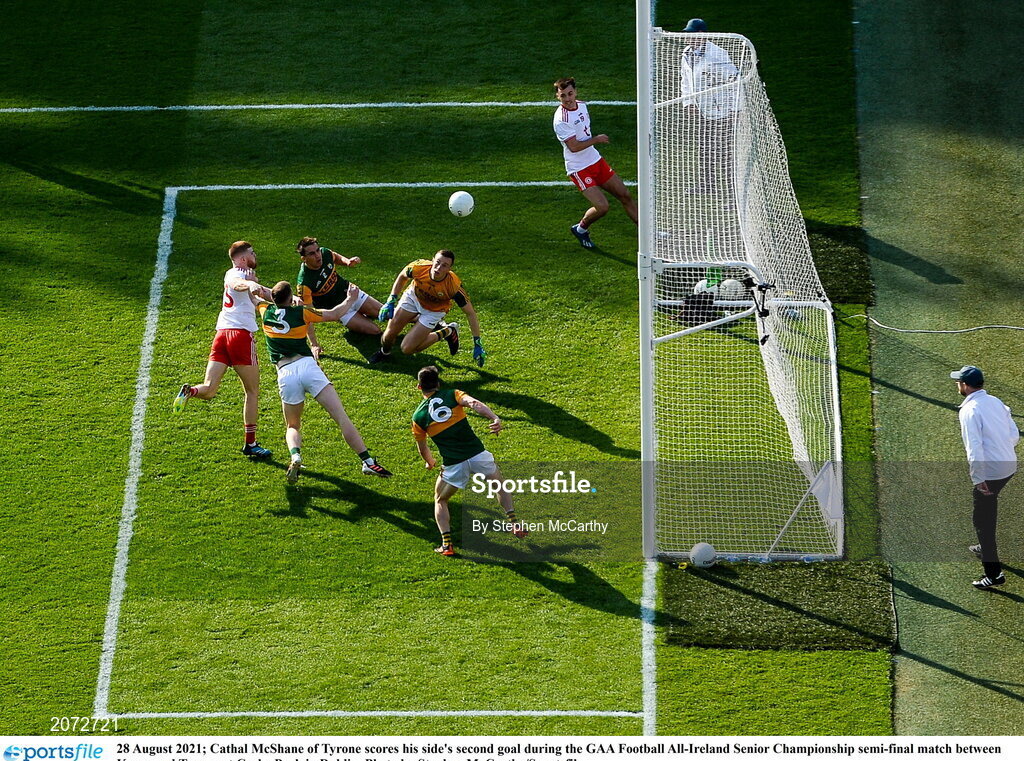 28 August 2021; Cathal McShane of Tyrone scores his side's second goal during the GAA Football All-Ireland Senior Championship semi-final match between Kerry and Tyrone at Croke Park in Dublin. Photo by Stephen McCarthy/Sportsfile