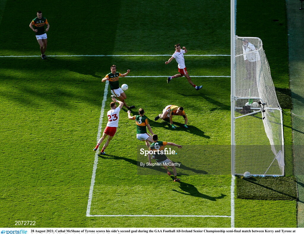 28 August 2021; Cathal McShane of Tyrone scores his side's second goal during the GAA Football All-Ireland Senior Championship semi-final match between Kerry and Tyrone at Croke Park in Dublin. Photo by Stephen McCarthy/Sportsfile