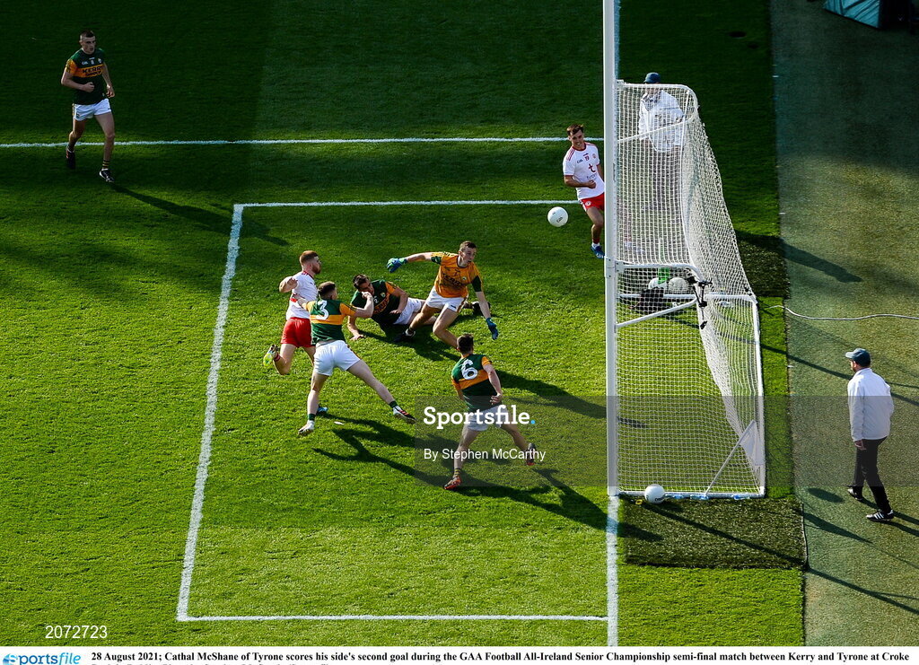 28 August 2021; Cathal McShane of Tyrone scores his side's second goal during the GAA Football All-Ireland Senior Championship semi-final match between Kerry and Tyrone at Croke Park in Dublin. Photo by Stephen McCarthy/Sportsfile