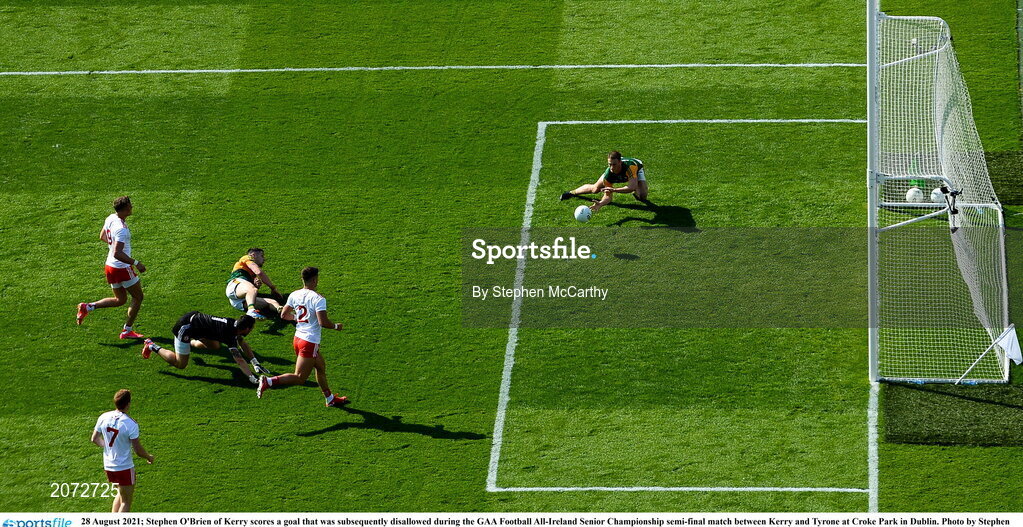 28 August 2021; Stephen O'Brien of Kerry scores a goal that was subsequently disallowed during the GAA Football All-Ireland Senior Championship semi-final match between Kerry and Tyrone at Croke Park in Dublin. Photo by Stephen McCarthy/Sportsfile