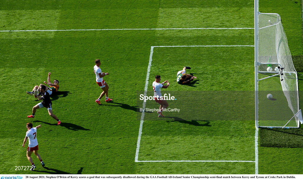 28 August 2021; Stephen O'Brien of Kerry scores a goal that was subsequently disallowed during the GAA Football All-Ireland Senior Championship semi-final match between Kerry and Tyrone at Croke Park in Dublin. Photo by Stephen McCarthy/Sportsfile