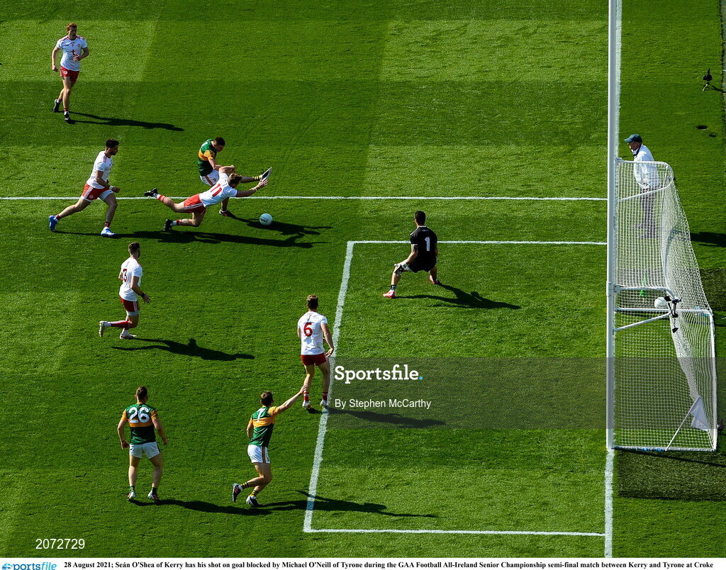 28 August 2021; Seán O'Shea of Kerry has his shot on goal blocked by Michael O'Neill of Tyrone during the GAA Football All-Ireland Senior Championship semi-final match between Kerry and Tyrone at Croke Park in Dublin. Photo by Stephen McCarthy/Sportsfile