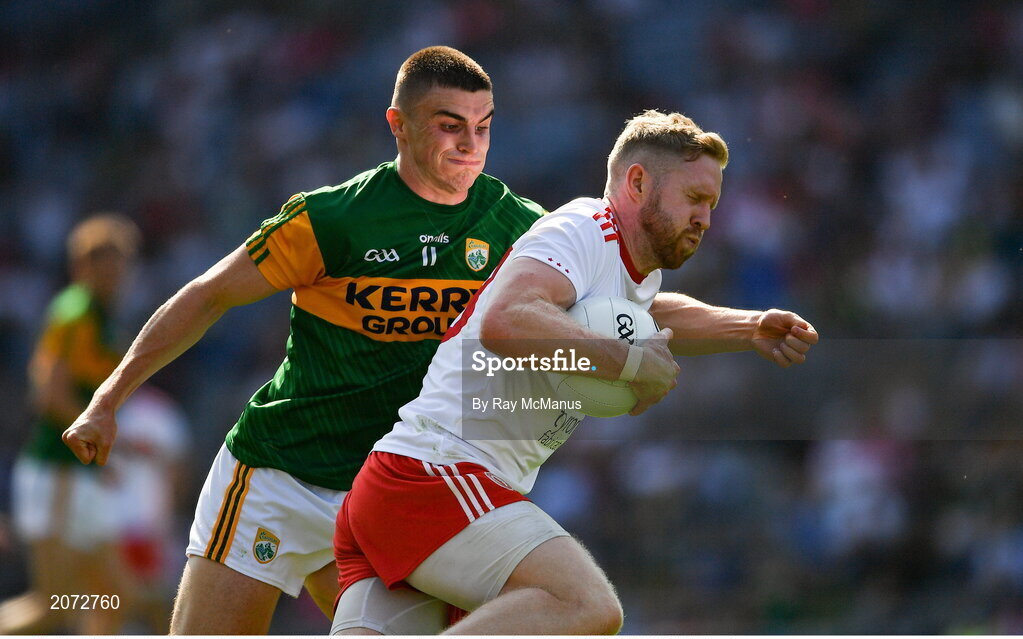 28 August 2021; Frank Burns of Tyrone in action against Seán O'Shea of Kerry during the GAA Football All-Ireland Senior Championship semi-final match between Kerry and Tyrone at Croke Park in Dublin. Photo by Ray McManus/Sportsfile