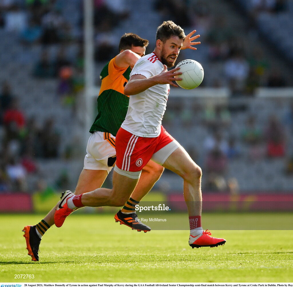 28 August 2021; Matthew Donnelly of Tyrone in action against Paul Murphy of Kerry during the GAA Football All-Ireland Senior Championship semi-final match between Kerry and Tyrone at Croke Park in Dublin. Photo by Ray McManus/Sportsfile