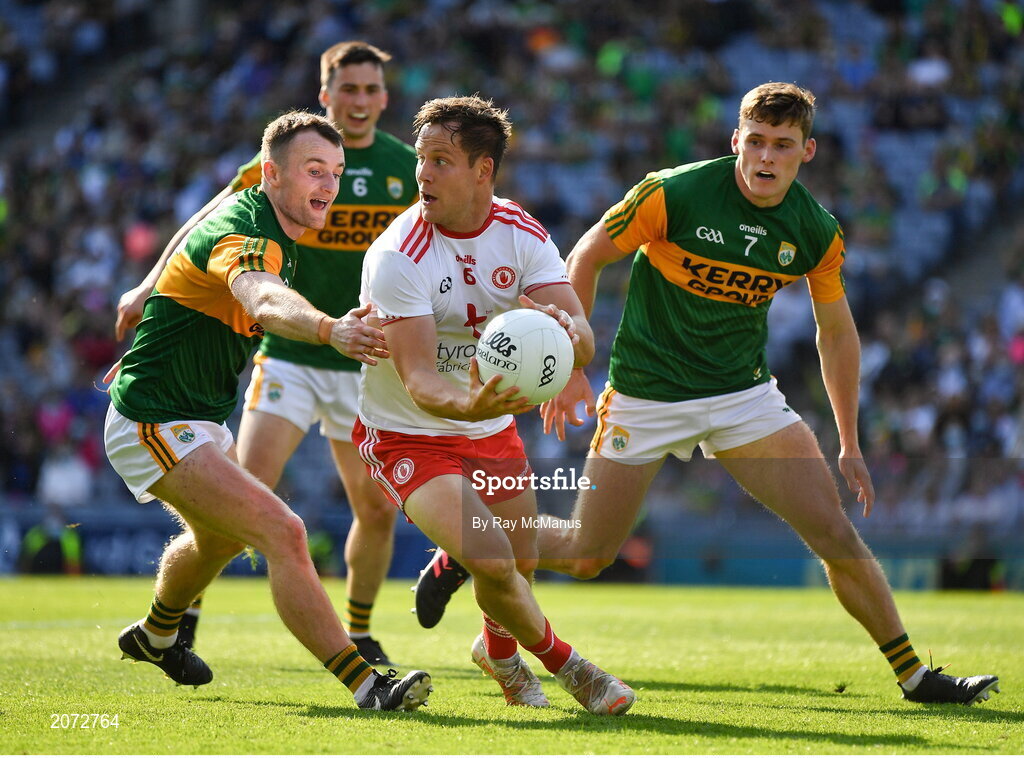 28 August 2021; Kieran McGeary of Tyrone in action against Tom O'Sullivan, left, Paul Murphy, 6, and Gavin White of Kerry during the GAA Football All-Ireland Senior Championship semi-final match between Kerry and Tyrone at Croke Park in Dublin. Photo by Ray McManus/Sportsfile