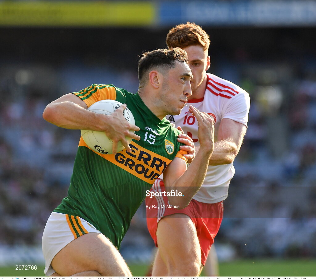 28 August 2021; Paudie Clifford of Kerry in action against Conor Meyler of Tyrone during the GAA Football All-Ireland Senior Championship semi-final match between Kerry and Tyrone at Croke Park in Dublin. Photo by Ray McManus/Sportsfile