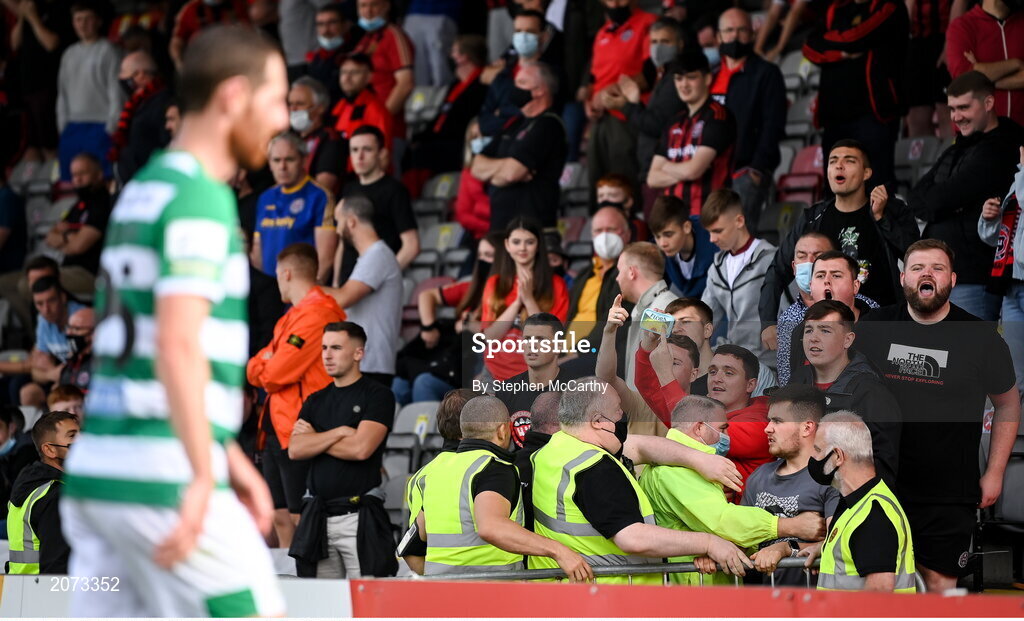 29 August 2021; A supporter holding a tub of butter taunts Shamrock Rovers players at half-time of the extra.ie FAI Cup second round match between Bohemians and Shamrock Rovers at Dalymount Park in Dublin. Photo by Stephen McCarthy/Sportsfile