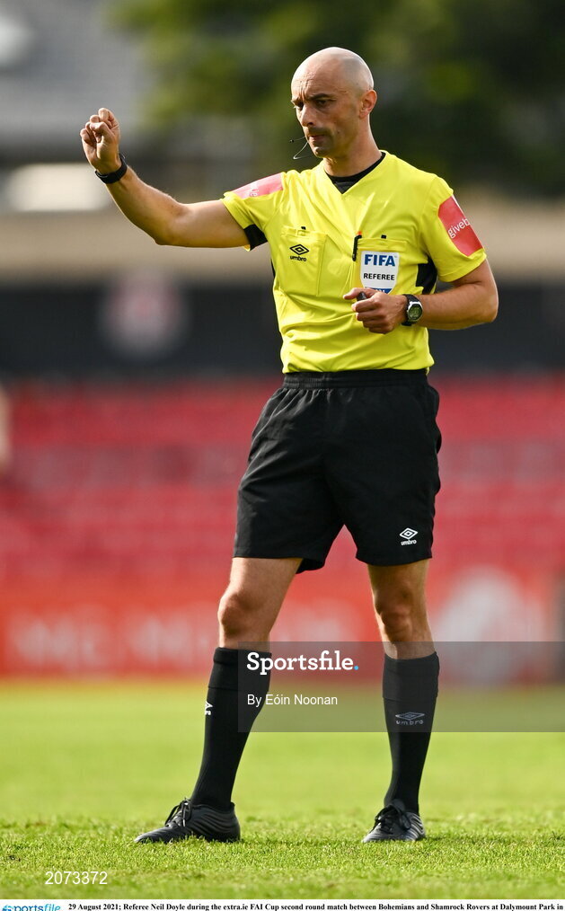 29 August 2021; Referee Neil Doyle during the extra.ie FAI Cup second round match between Bohemians and Shamrock Rovers at Dalymount Park in Dublin. Photo by Eóin Noonan/Sportsfile