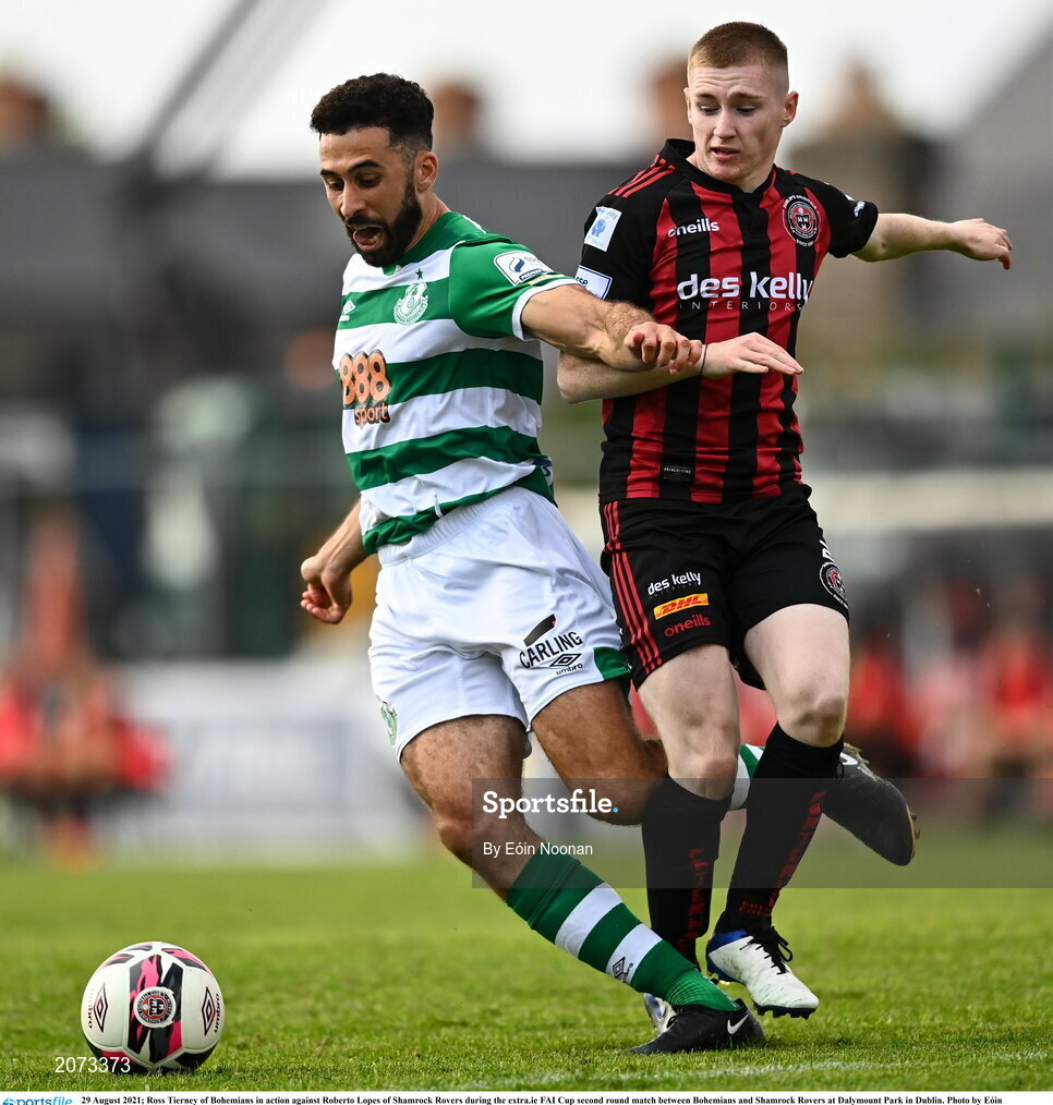 29 August 2021; Ross Tierney of Bohemians in action against Roberto Lopes of Shamrock Rovers during the extra.ie FAI Cup second round match between Bohemians and Shamrock Rovers at Dalymount Park in Dublin. Photo by Eóin Noonan/Sportsfile