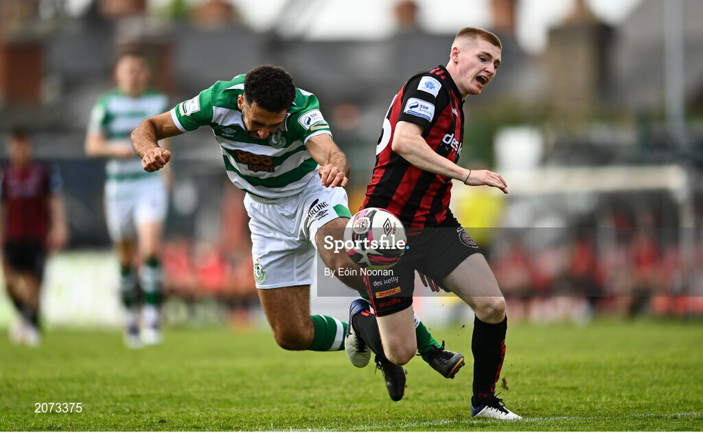 29 August 2021; Ross Tierney of Bohemians in action against Roberto Lopes of Shamrock Rovers during the extra.ie FAI Cup second round match between Bohemians and Shamrock Rovers at Dalymount Park in Dublin. Photo by Eóin Noonan/Sportsfile