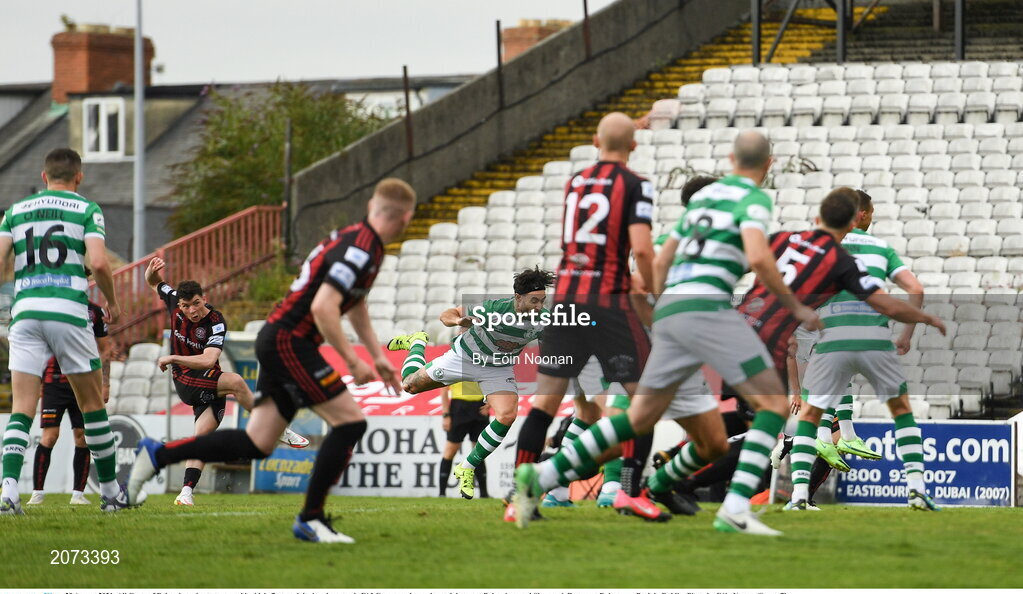 29 August 2021; Ali Coote of Bohemians shoots to score his side's first goal during the extra.ie FAI Cup second round match between Bohemians and Shamrock Rovers at Dalymount Park in Dublin. Photo by Eóin Noonan/Sportsfile