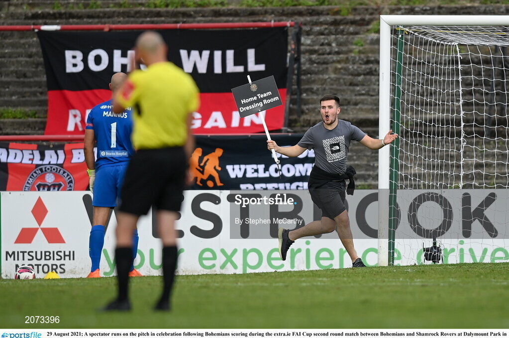 29 August 2021; A spectator runs on the pitch in celebration following Bohemians scoring during the extra.ie FAI Cup second round match between Bohemians and Shamrock Rovers at Dalymount Park in Dublin. Photo by Stephen McCarthy/Sportsfile