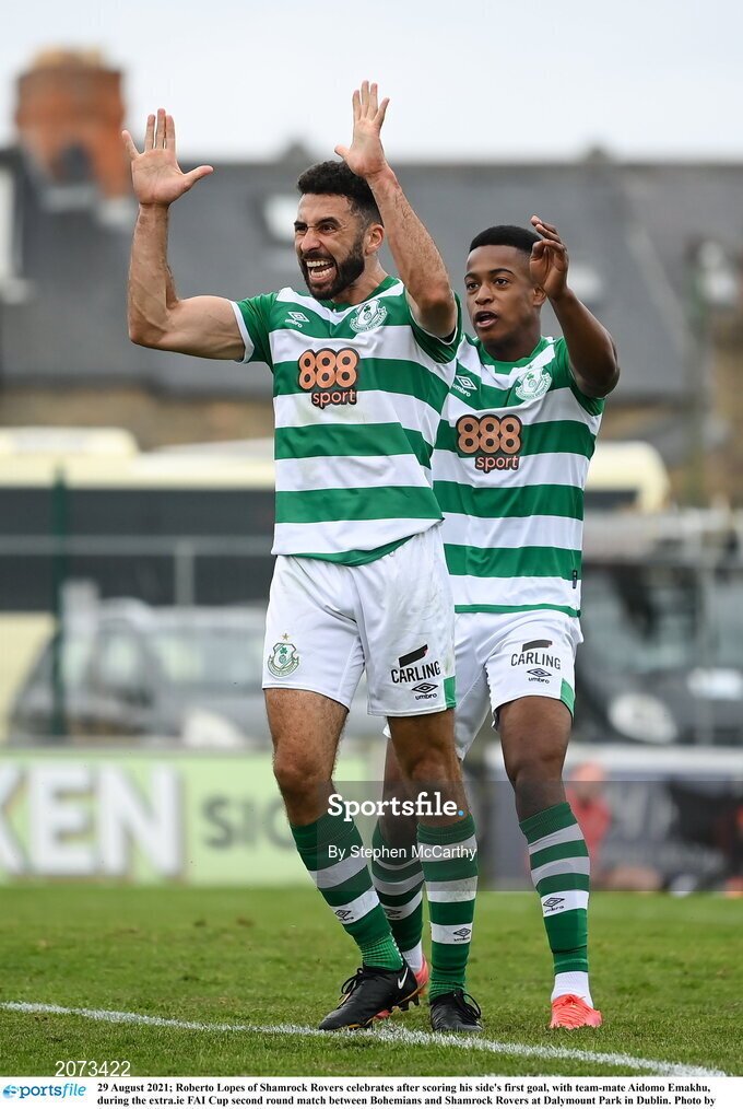 29 August 2021; Roberto Lopes of Shamrock Rovers celebrates after scoring his side's first goal, with team-mate Aidomo Emakhu, during the extra.ie FAI Cup second round match between Bohemians and Shamrock Rovers at Dalymount Park in Dublin. Photo by Stephen McCarthy/Sportsfile