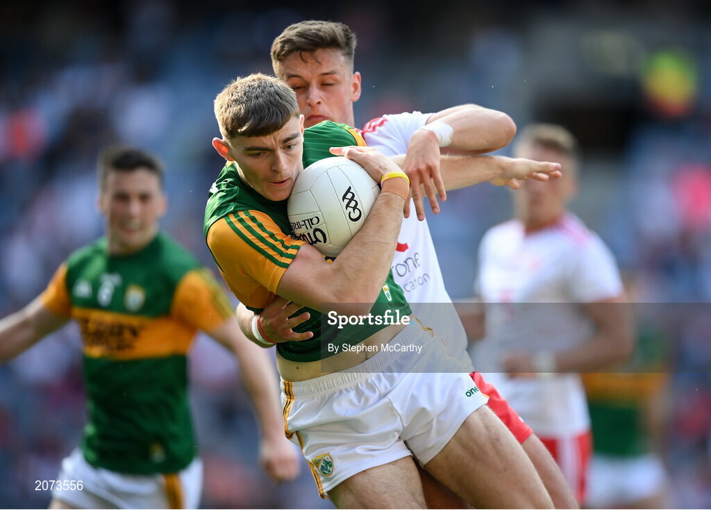 28 August 2021; Diarmuid O'Connor of Kerry is tackled by Michael McKernan of Tyrone during the GAA Football All-Ireland Senior Championship semi-final match between Kerry and Tyrone at Croke Park in Dublin. Photo by Stephen McCarthy/Sportsfile