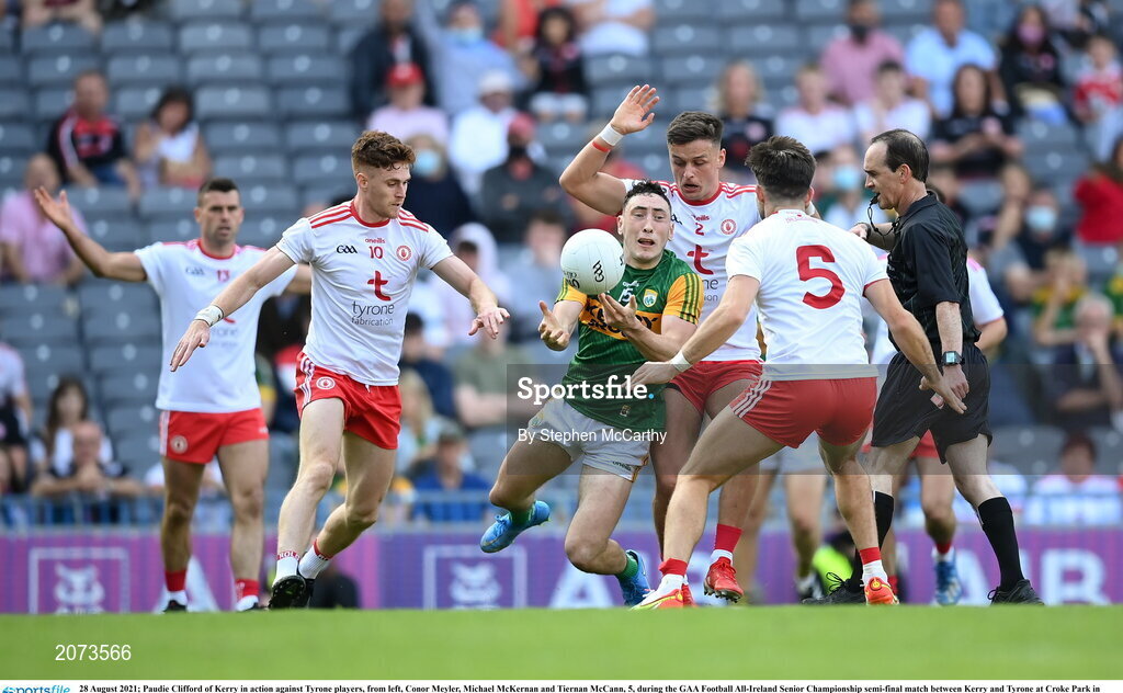 28 August 2021; Paudie Clifford of Kerry in action against Tyrone players, from left, Conor Meyler, Michael McKernan and Tiernan McCann, 5, during the GAA Football All-Ireland Senior Championship semi-final match between Kerry and Tyrone at Croke Park in Dublin. Photo by Stephen McCarthy/Sportsfile