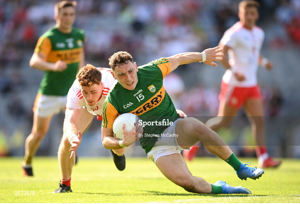 28 August 2021; Paudie Clifford of Kerry in action against Conor Meyler of Tyrone during the GAA Football All-Ireland Senior Championship semi-final match between Kerry and Tyrone at Croke Park in Dublin. Photo by Stephen McCarthy/Sportsfile