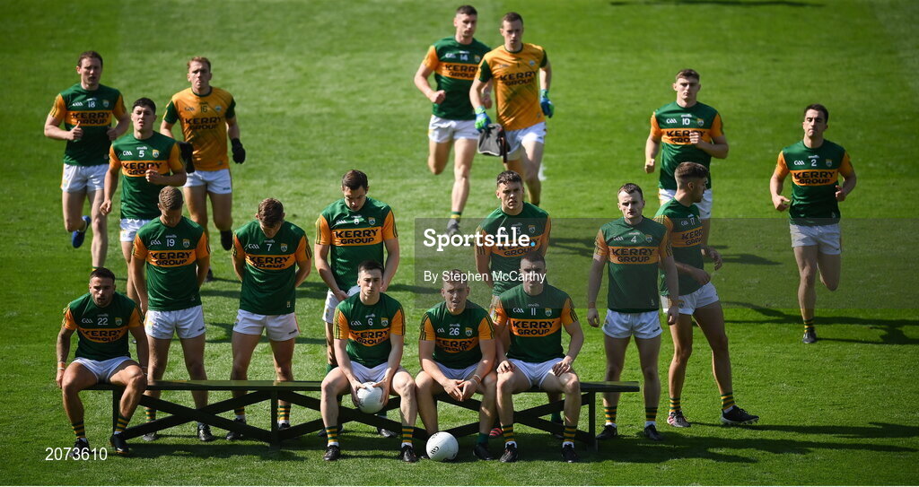 28 August 2021; Kerry players prepare to have their team photograph taken before the GAA Football All-Ireland Senior Championship semi-final match between Kerry and Tyrone at Croke Park in Dublin. Photo by Stephen McCarthy/Sportsfile