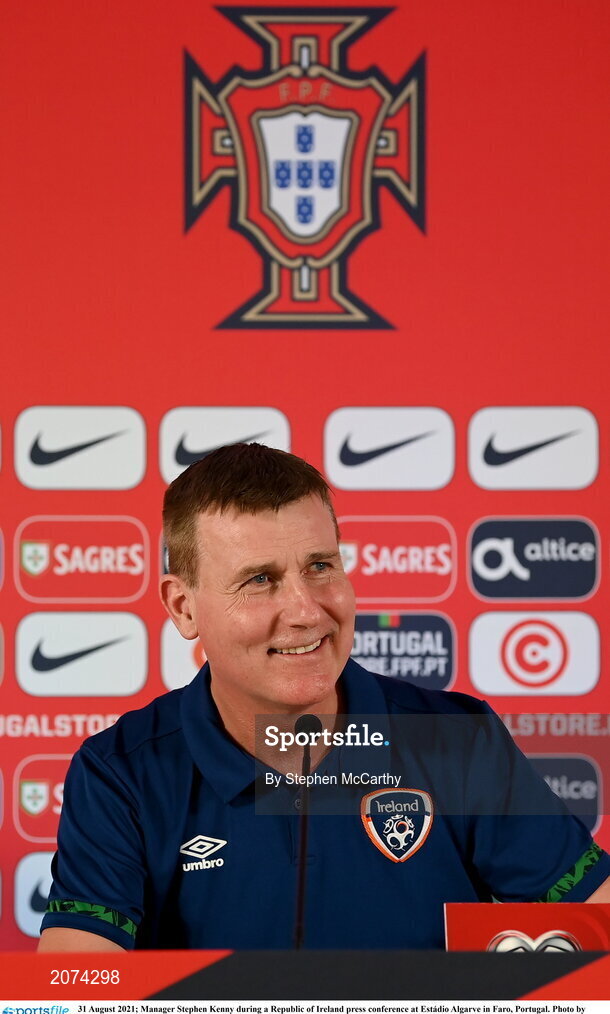 31 August 2021; Manager Stephen Kenny during a Republic of Ireland press conference at Estádio Algarve in Faro, Portugal. Photo by Stephen McCarthy/Sportsfile