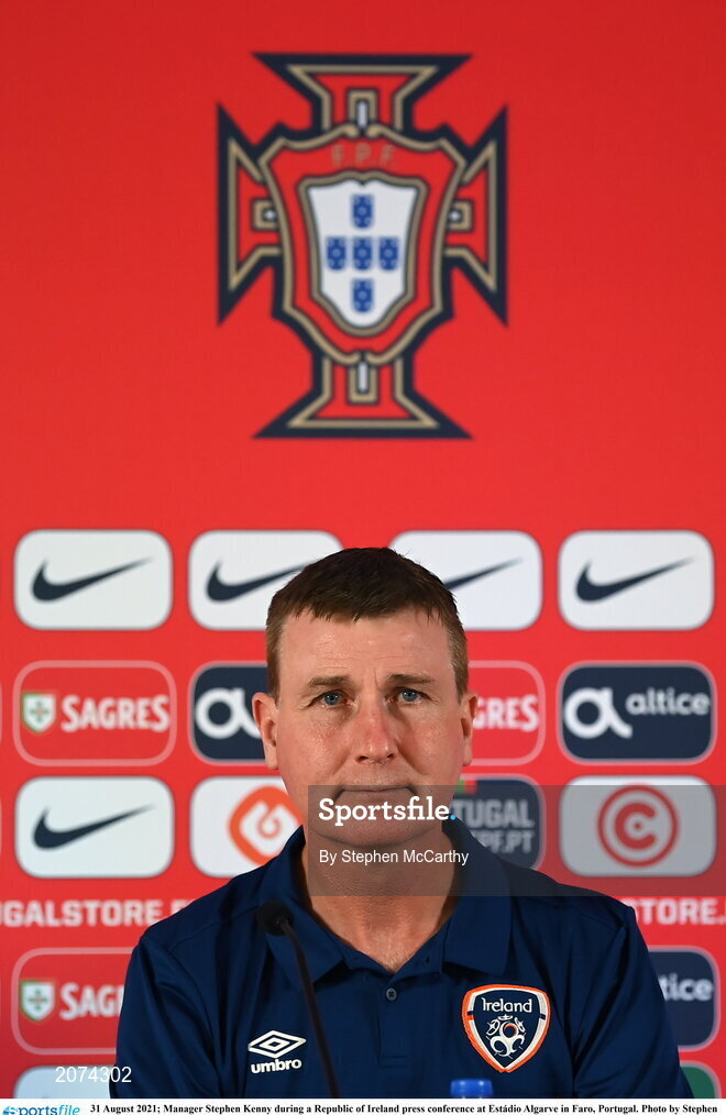 31 August 2021; Manager Stephen Kenny during a Republic of Ireland press conference at Estádio Algarve in Faro, Portugal. Photo by Stephen McCarthy/Sportsfile