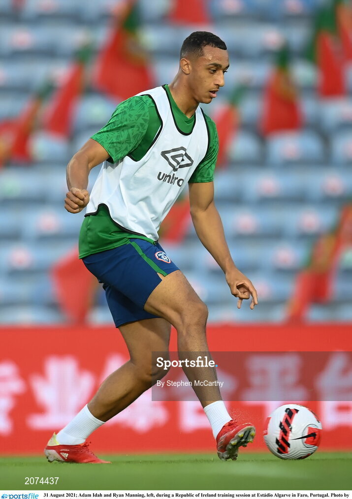 31 August 2021; Adam Idah and Ryan Manning, left, during a Republic of Ireland training session at Estádio Algarve in Faro, Portugal. Photo by Stephen McCarthy/Sportsfile