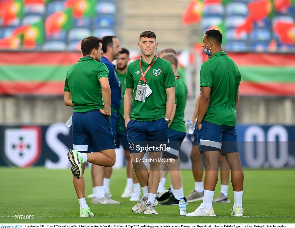 1 September 2021; Dara O'Shea of Republic of Ireland, centre, before the FIFA World Cup 2022 qualifying group A match between Portugal and Republic of Ireland at Estádio Algarve in Faro, Portugal. Photo by Stephen McCarthy/Sportsfile