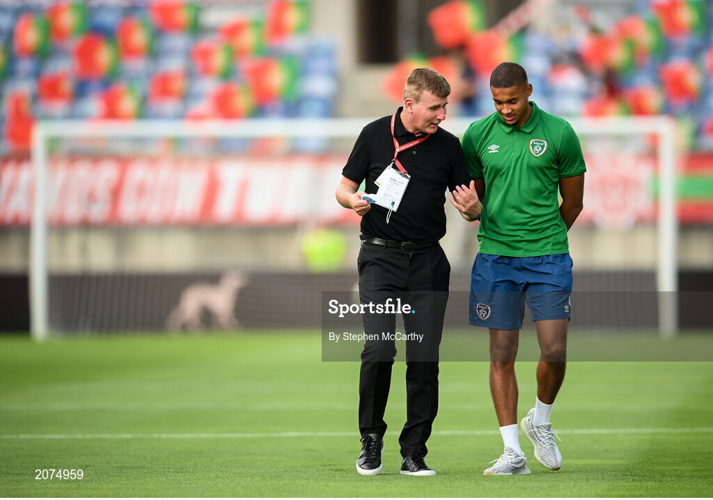 1 September 2021; Republic of Ireland manager Stephen Kenny with goalkeeper Gavin Bazunu during the FIFA World Cup 2022 qualifying group A match between Portugal and Republic of Ireland at Estádio Algarve in Faro, Portugal. Photo by Stephen McCarthy/Sportsfile