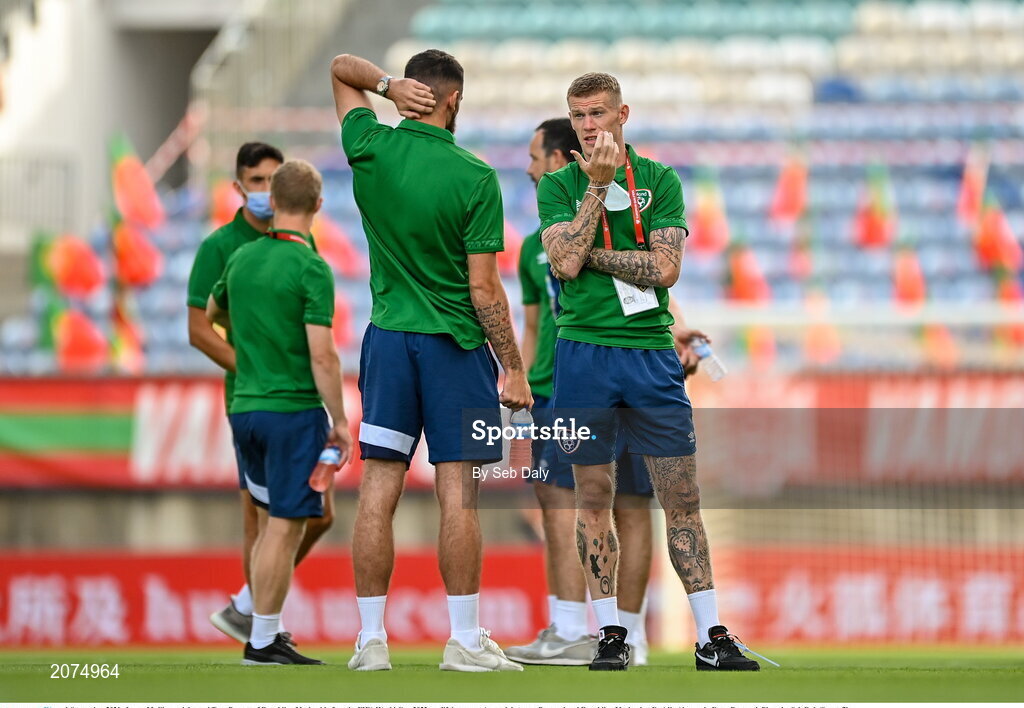 1 September 2021; James McClean, right, and Troy Parrott of Republic of Ireland before the FIFA World Cup 2022 qualifying group A match between Portugal and Republic of Ireland at Estádio Algarve in Faro, Portugal. Photo by Seb Daly/Sportsfile