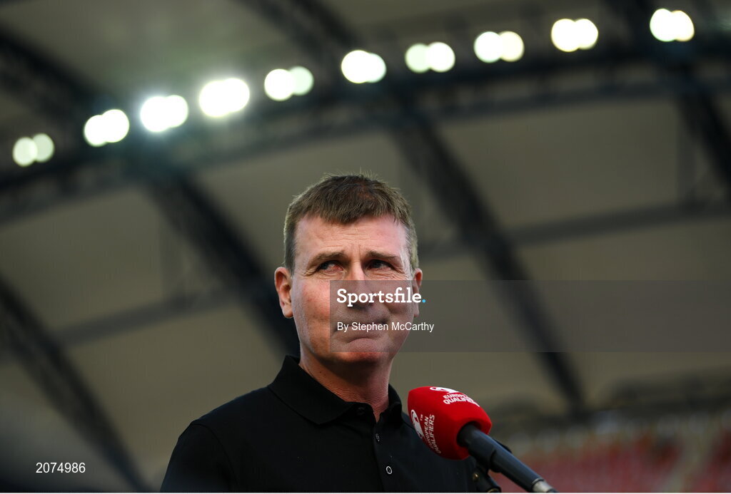 1 September 2021; Republic of Ireland manager Stephen Kenny is interviewed before the FIFA World Cup 2022 qualifying group A match between Portugal and Republic of Ireland at Estádio Algarve in Faro, Portugal. Photo by Stephen McCarthy/Sportsfile